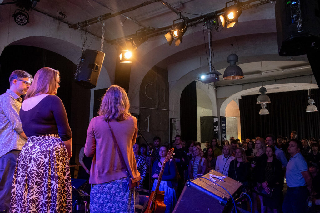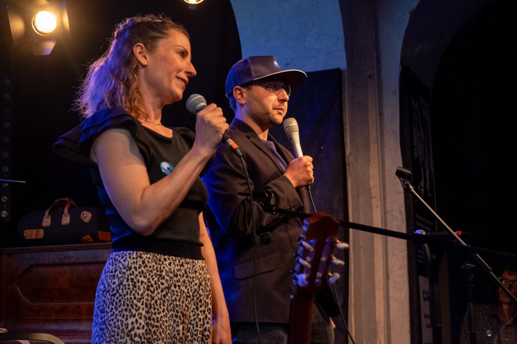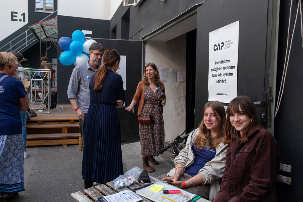 Večer úvodním slovem (a vtipem) zahájili Filip a Kristina, poté přišlo na řadu představení nového projektu, Centrum advokační podpory, který bude pomáhat rodinám v těžkých životních situacích bojovat za svá práva, důstojnost a přístup ke službám. Petra a Petr Třešňákovi představili jeho vedoucí Alenu Noskovou a debatovali o motivaci jeho vzniku a představě budoucího fungování.