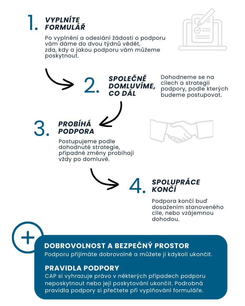 O podporu požádejte vyplněním krátkého formuláře. CAP podporuje jednotlivce a rodiny, které: